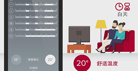 始終設(shè)置一個(gè)采暖溫度會(huì)極大低浪費(fèi)能源,通過APP,你可以根據(jù)生活節(jié)奏設(shè)定兩個(gè)溫區(qū)和一周采暖編程,節(jié)約能源更省錢